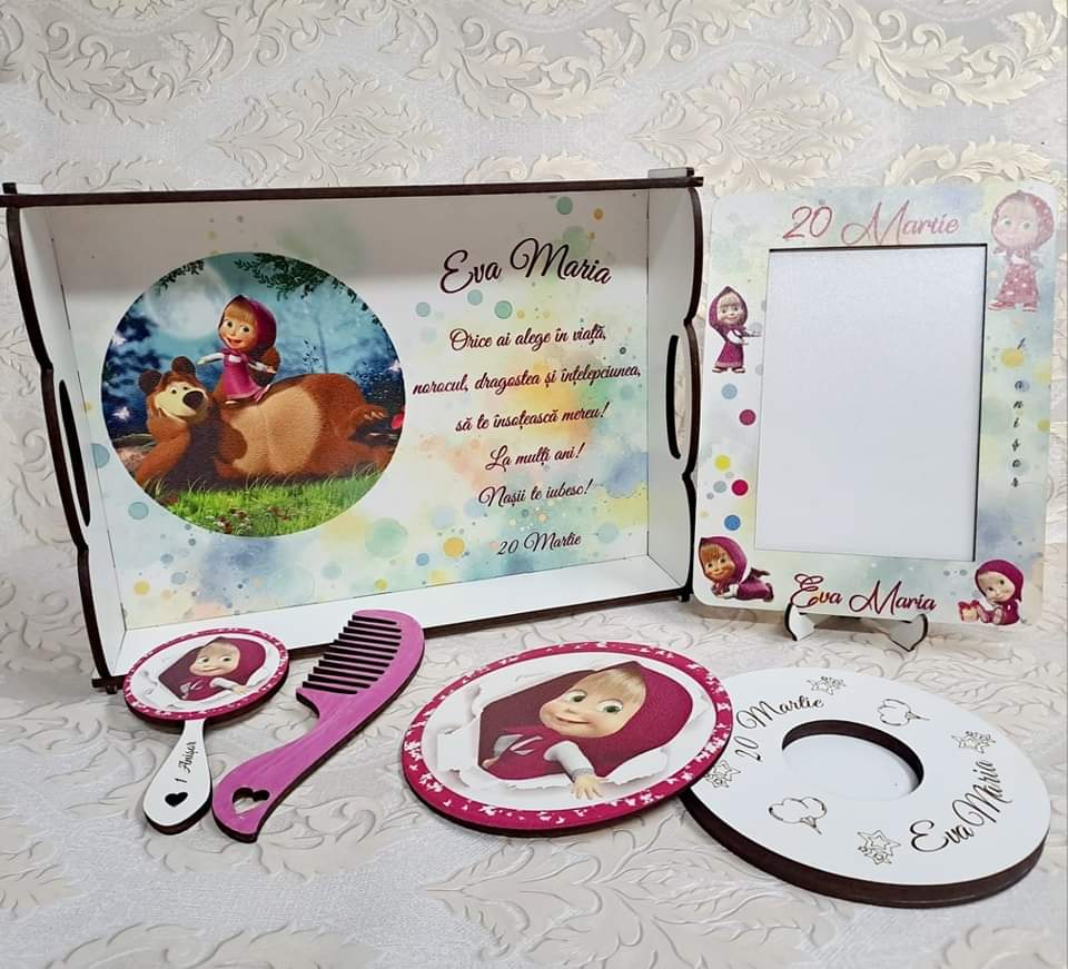 Setul le cuprinde toate tava, oglinda, piepten, cutiuta gravata, rama foto